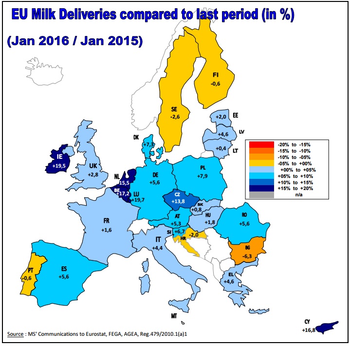 EU milk production increased 5.6% in January 2016 compared to the corresponding period in 2015, the latest figures from the Milk Market Observatory (MMO) show.