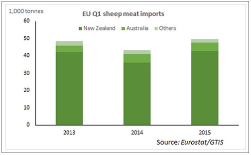 This was despite a fall in New Zealand production in the first quarter of 2015 as a fall in shipments from New Zealand to their largest single country market, China, has left increased volumes available for export to the EU, Eblex says.