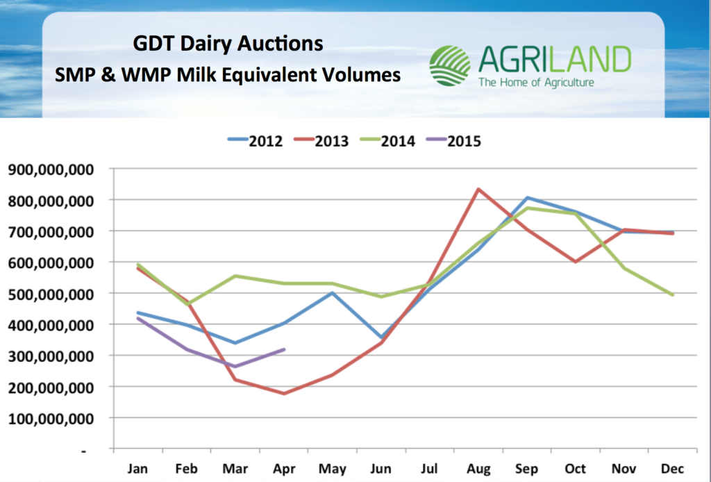 To put this in perspective, when you look at the approximate SMP and WMP milk equivalent volumes sold for auction between December 2014 and April 2015, compared with the corresponding period the previous year, it equates to approximately 1.2 billion litres less milk sold through this auction platform during this six-month period. This is equivalent to over one-fifth of Ireland’s milk pool.