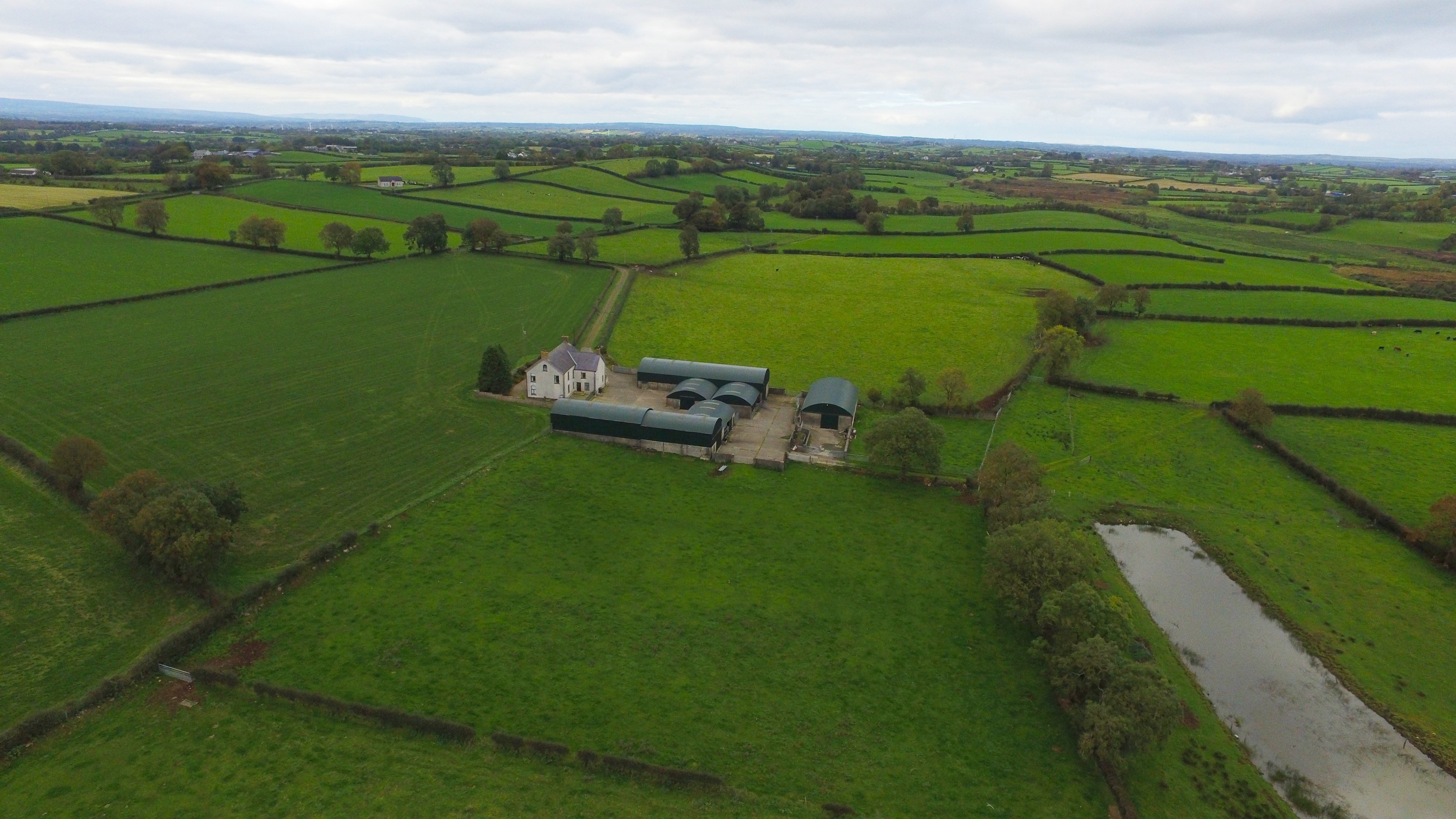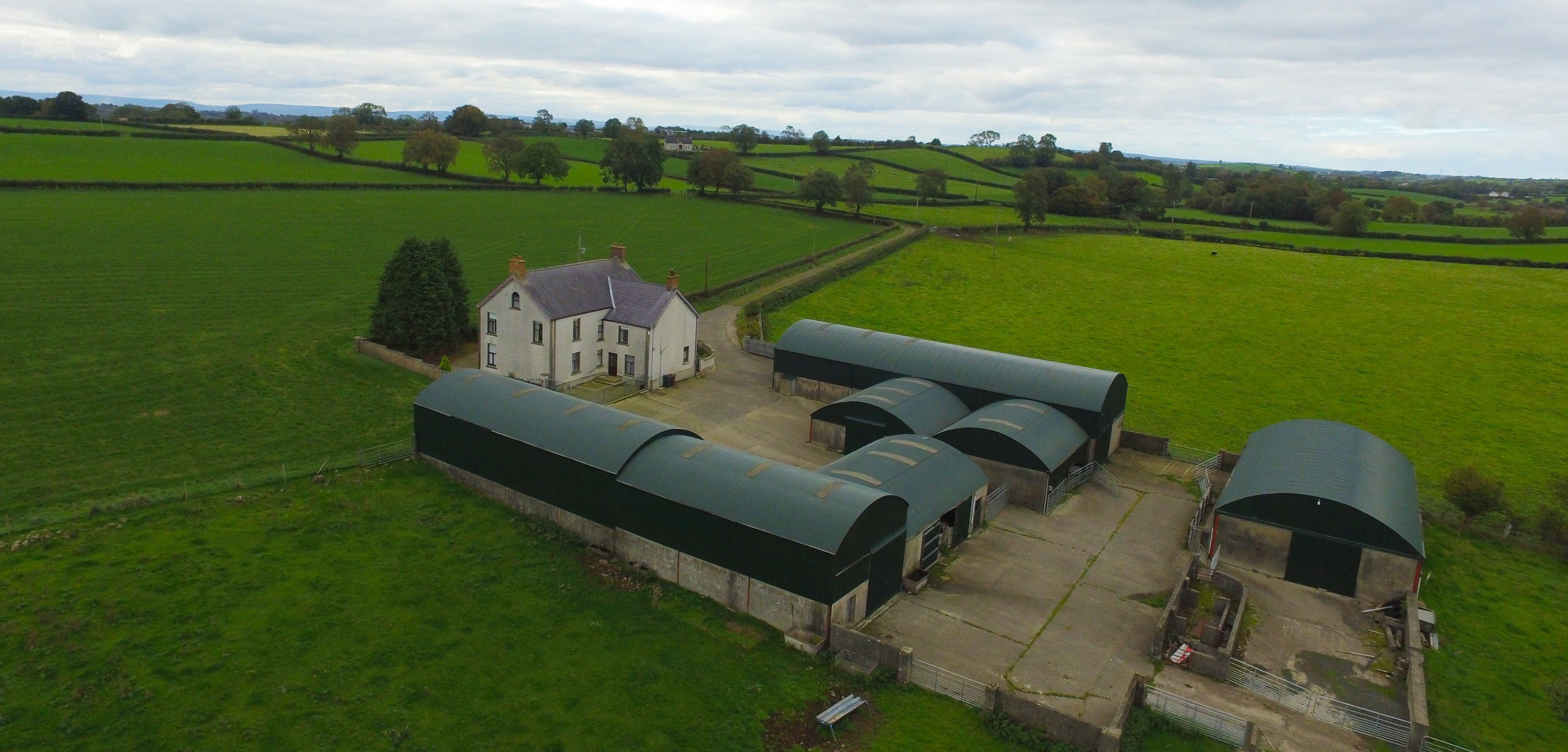 An extensive 98ac farm, Ashdene, is new to the market at 48 Loughabin Road, Dunloy, Ballymena, Co. Antrim. The holding includes a residence, a farmyard, outbuildings, and land.