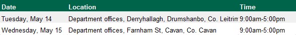 This service will be available for extended hours in the run up to the May 15 deadline in the department’s offices in Government Offices, Abbeyleix Road, Portlaoise.