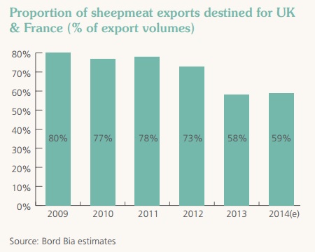 Ireland’s dependence on the British and French markets for sheepmeat exports has fallen by 21% since 2009, according to Bord Bia figures.