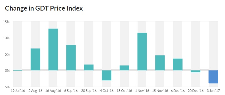 The first Global Dairy Trade auction of 2017 has seen prices at the event fall 3.9%. The drop follows a a decrease of 0.5% at the last auction of 2016.