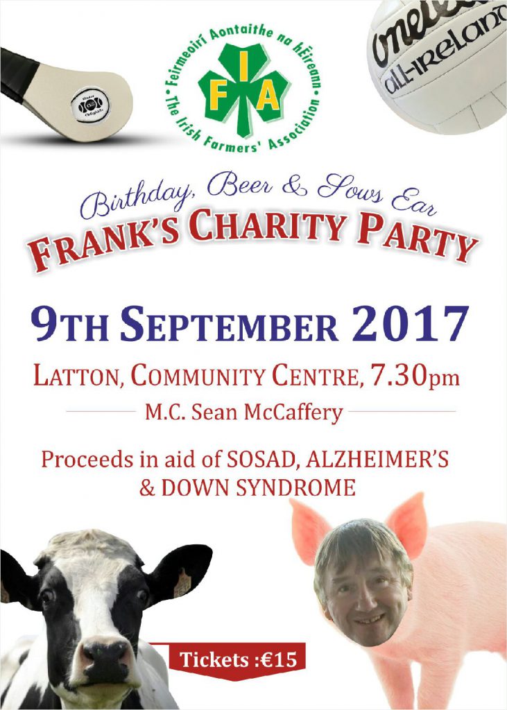 A farmers’ good-cause barbecue, titled “Frank’s Charity Party”, will be held tomorrow night (Saturday, September 9), in Co. Monaghan for three excellent causes.
