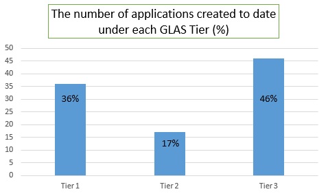 The figures show that to date 5,481 or 36% applications have been created by farmers in Tier 1 which comprise of those with priority environmental assets identified for support through GLAS, targeting vulnerable landscapes (including commonages), important bird-species and protection of high-status watercourses.