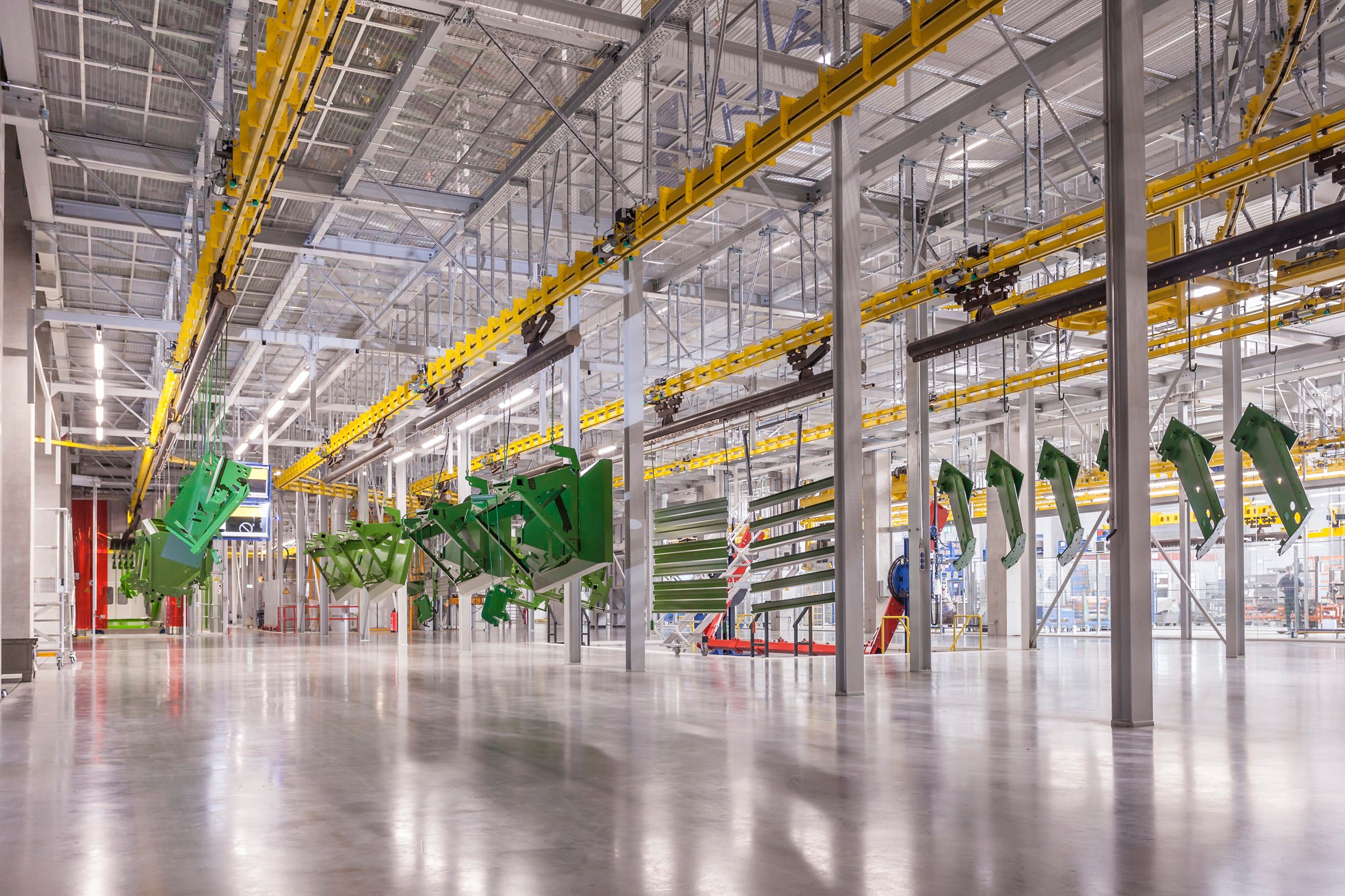 The plant is digitally controlled and is divided into several operational areas. These include hanging up and taking off stations, a pre-treatment and primer coating hall, three curing ovens and a dip-paint and powder-coating area.