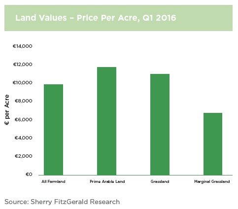 Strong price growth in 2015 of 1.6% was somewhat counteracted by a 0.5% fall in the average price of prime grassland in the three months to March 2016 which stood at approximately €10,900/ac, it found.