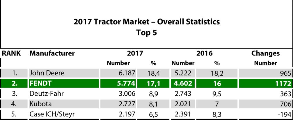 Fendt was in second position, with sales of 5,774 new tractors – or 17.1% of the market. That’s up from 16% in 2016.