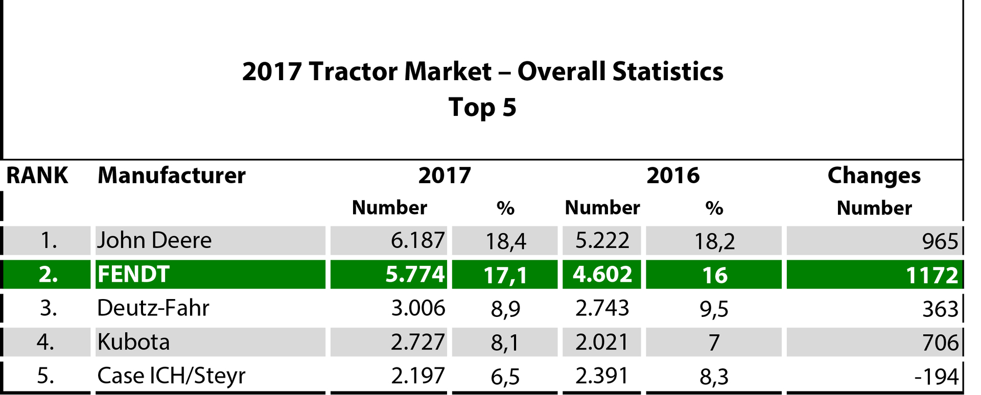 The German Motor Vehicle Office (KBA) has released its 2017 registration figures for tractors, which show Fendt in second position (for new tractor sales).