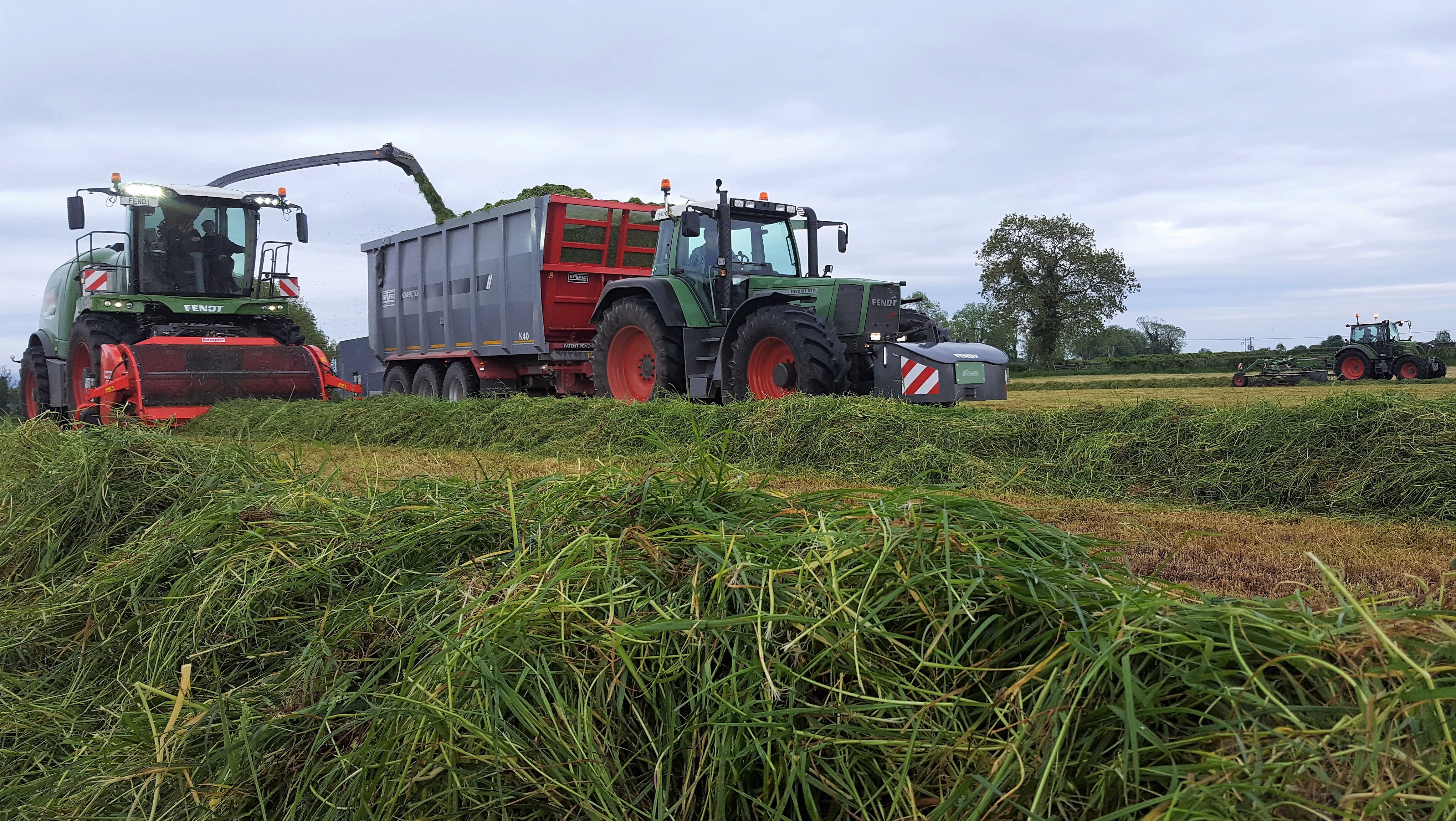 The star of the show was this Katana 65 self-propelled forage harvester (pictured below). It’s photographed here side-filling into a triple-axle Hi-Spec K40 Kompactor which, in turn, is hitched up to a pristine (but far from brand new) Fendt Favorit 824.