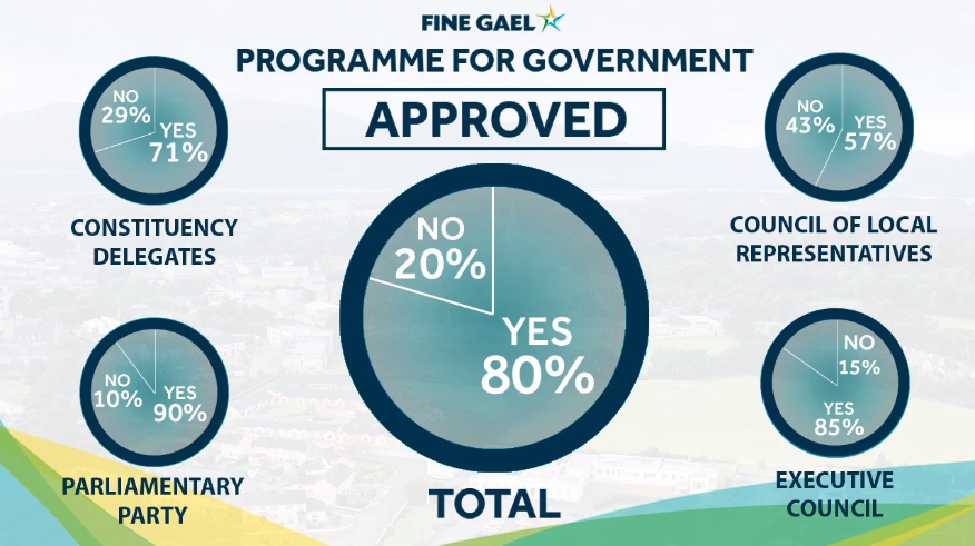 Overall, 80% voted to approve the Programme for Government. However, within the parliamentary party the level of support was even higher; 90% of TDs and senators voted in favour.