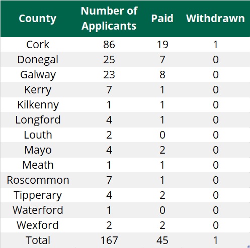 The table below shows the number of applicants on a county-by-county basis and which ones have already received payment.