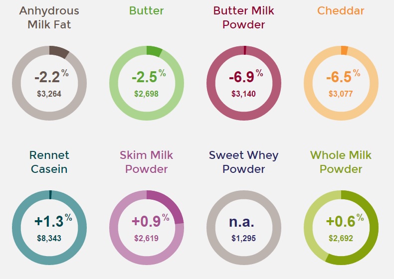 It says while buyer demand and slightly lower volumes appear to have supported milk powder prices, other products showed further declines. Butter fell by a further 2.5%, while Cheddar prices decreased by 6.5%. However, prices achieved for these products in the EU do not track as closely to the GDT outcome.