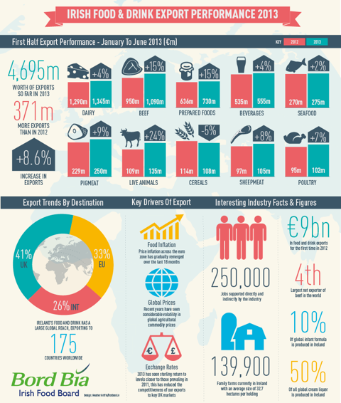 Commenting on the outcome, Aidan Cotter, ceo of Bord Bia said: “The export figures for the first half of the year are particularly impressive at a time when overall exports have fallen by some 6 per cent. Last year, Ireland’s food and drink exports surpassed the €9bn mark for the first time and the prospects for the remainder of 2013 remain broadly positive with a strong demand for dairy and beef, combined with a more robust prepared foods performance and further steady growth in beverages.”
