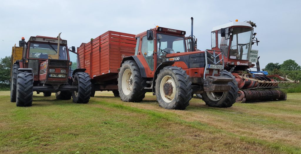 The harvester filled several loads, typically pairing off with a matching Fiat (Fiatagri) tractor each time.