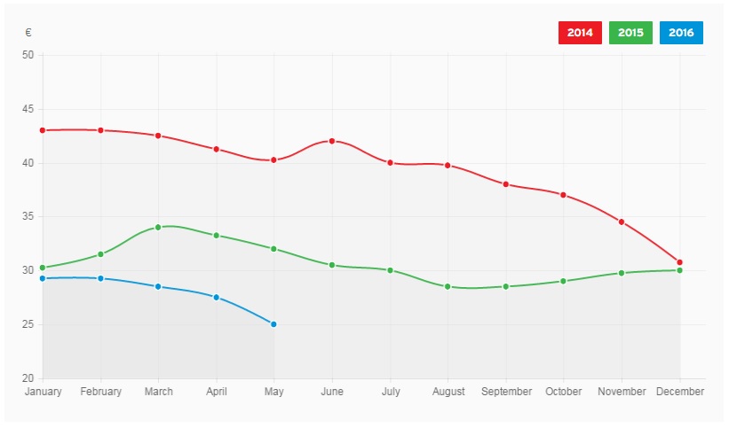 The protein price in May 2016 is €408.10, the fat price is €204.05 and the lactose price is €40.81 per 100kg.