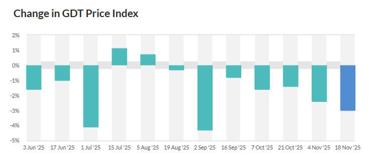 Dairy prices fell across the board in the latest Global Dairy Trade (GDT) auction dipping by a further 3% today (Tuesday, November 18)