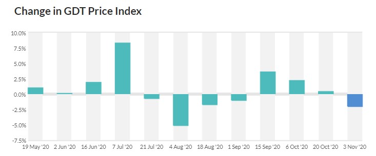 The Global Dairy Trade (GDT) index has dropped for the first time in four auctions, following three consecutive increases.