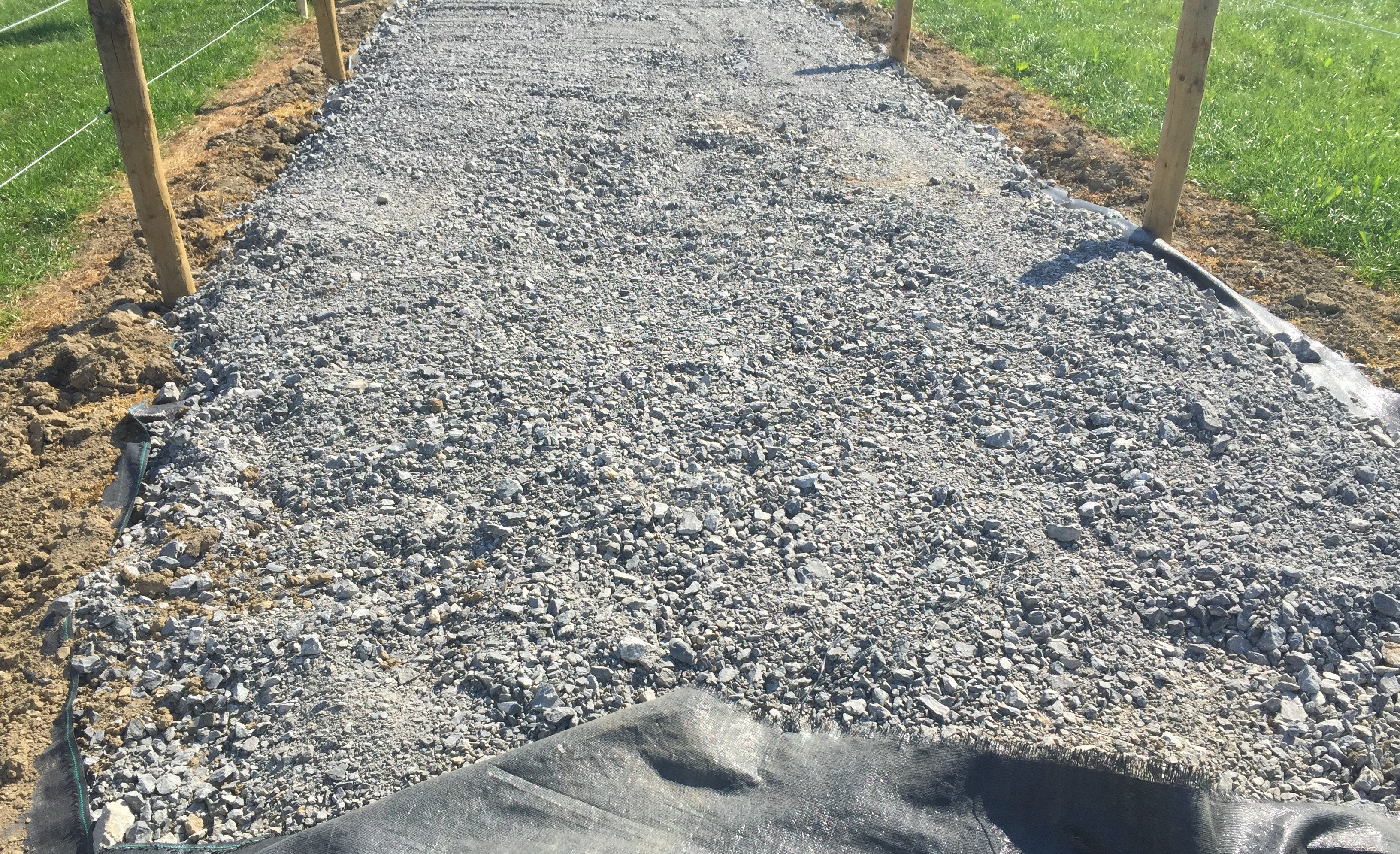 To reduce costs, no surface material was removed prior to installing the roadway. It consists of a 5in layer of 3in down trunking and 3in of surface blinding.