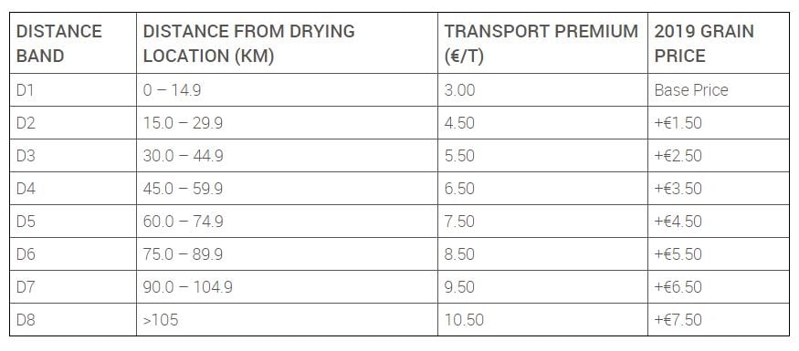 The further away the grower is from the drying location, the transport premium increases. The table below shows the transport premium and the distances. It is up to the farmer to organise the delivery of grain and pay the haulier.