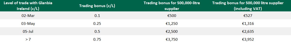The milk supplier trading bonus is worth up to €3,750 to a 500,000-litre supplier spending over 7c/L with Glanbia Ireland this year.