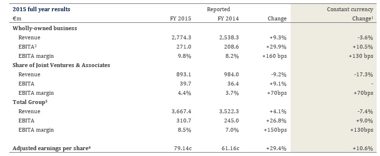Total Group revenue was €3,667.4m and earnings before interest, taxes and amortization (EBITA) was at€310.7m – up from €245.0m in 2014. Adjusted earnings per share was 79.14c.