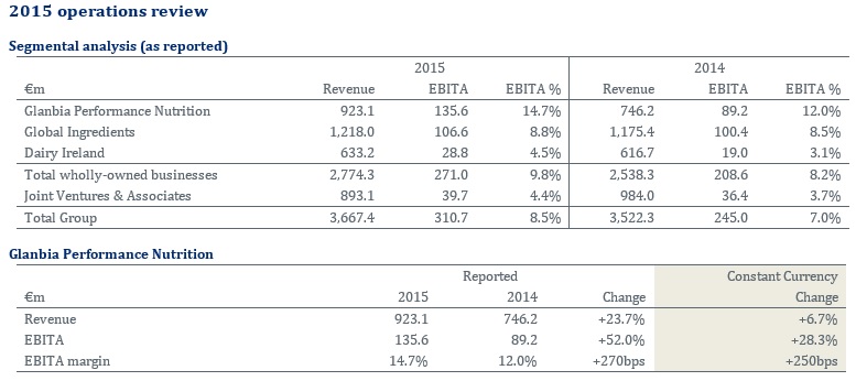 Consumer Products delivered a good performance in 2015. The investment in operational efficiencies, mix improvement and some reduction in input costs enabled a recovery in margins. Revenue growth was driven by increases in value added milk and cream sales plus bolt on acquisitions. Glanbia will continue to innovate and invest in its brand portfolio both domestically and internationally.