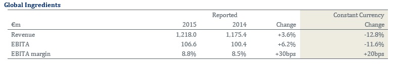 Global Ingredients (GI) had a reduced performance in 2015 as a result of difficult dairy markets which impacted US Cheese and Ingredient Technologies. Revenues decreased 12.8% to €1,218.0m reflecting market related price decreases of 17.8% which were partially offset by a volume increase of 5.0%. As a result EBITA decreased 11.6% to €106.6m.
