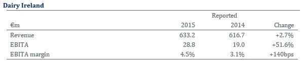 Dairy Ireland delivered a good performance in 2015 driven primarily by Consumer Products. Revenues increased 2.7% reflecting a 1.8% increase in volumes and a 0.5% decline in pricing. Bolt on acquisitions in Consumer Products contributed 1.4%. EBITA margins recovered by 140 basis points to 4.5%.