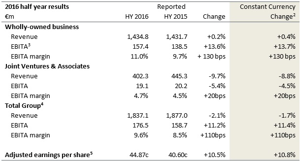 Glanbia announced its results for the six months ended 02 July 2016 this morning, which also showed wholly owned revenue steady at €1,434.8m, an increase of just 0.4% constant currency (up 0.2% reported).