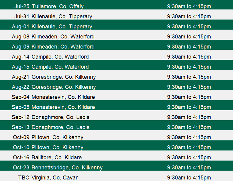 The checks will take place on the dates and places as listed below, according to Glanbia.