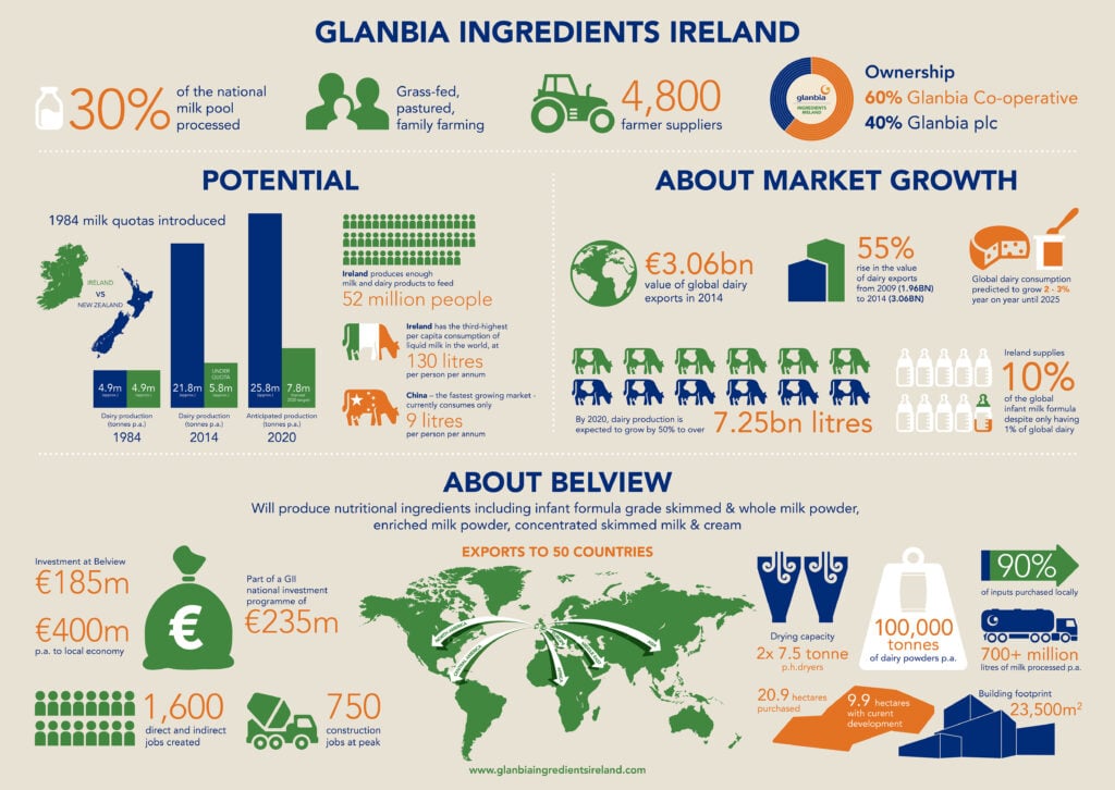 By 2020, Glanbia’s 4,800 milk suppliers expect to increase milk production by 63%. Currently Glanbia Ingredients Ireland processes 1.8 billion litres of milk or 30% of Ireland’s milk pool into a range of dairy ingredients for export to more than 50 countries.