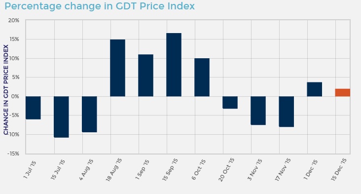 Dairy product prices increased by 1.9% at today’s Global Dairy Trade auction the last auction of 2015.