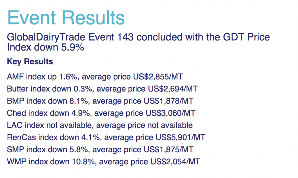 Whole milk powder was the big casualty, falling by 10.8% while butter milk powder prices fell by 8.1%.