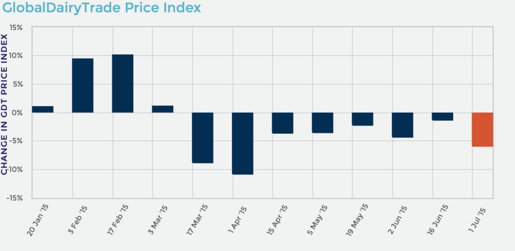 At its latest auction, today (July 1) the Global Dairy Trade fell by 5.9%. At the last auction on June 16, it fell by 1.3% and today’s is the most severe drop since April 1 when it fell by over 10%.