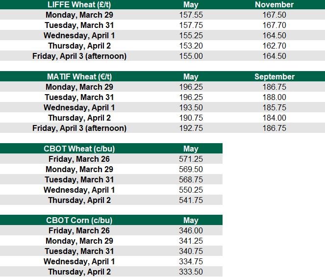 Matif wheat for May and September hit €190.75/t and €184/t respectively on Thursday evening, April 2. That’s the lowest those prices had been since March 19 when they were at €189.25/t and €183/t respectively. By Friday afternoon, they had increased, but not back to recent highs.