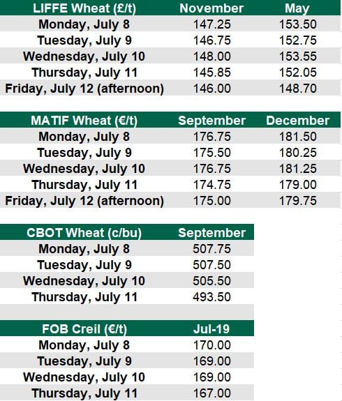 The positive harvest on the continent is having an effect on the Free-On-Board (FOB) Creil price. On Tuesday, July 16, of this week, it drifted below €170/t to €169/t. By Thursday it was at €167/t.