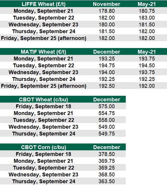 Matif wheat increased this week, hitting €194/t on Wednesday, September 23, before dropping back to last week’s closing levels on Friday afternoon when it hit €192.50/t for December.