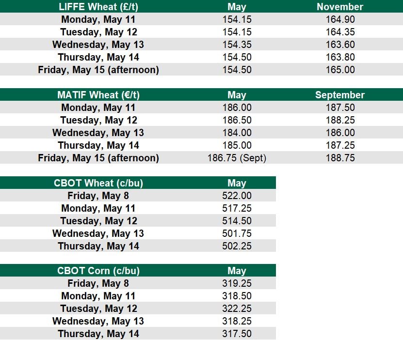 Spot prices were up on Friday morning, May 15. Feed barley (delivered Rouen) was at €166/t, while the spot price for Free-On-Board (FOB) Creil malting barley was at €168/t at the same time.