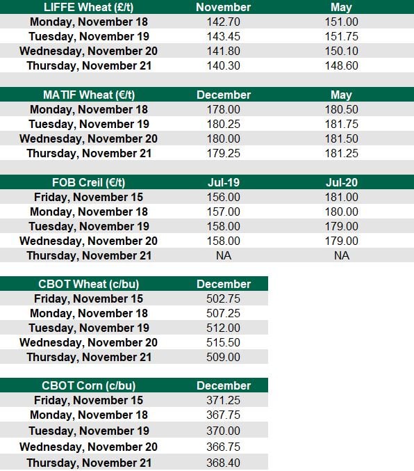 There was little excitement in grain markets this week. Chicago Board of Trade (CBOT) wheat climbed slightly on the back of reduced crop condition scores, while MATIF wheat for December moved up by approximately €3/t in the week. LIFFE wheat dropped slightly.