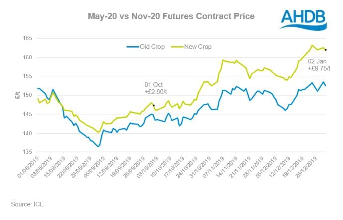 The new crop premium can be at least partly attributed to a fear of a smaller UK crop following a wet winter which saw less winter crops planted.
