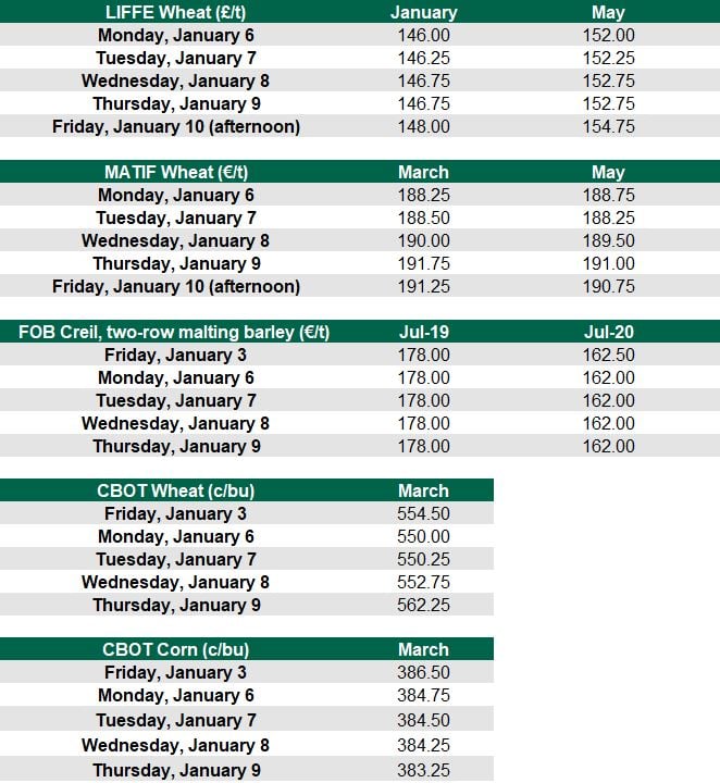 The table below shows how prices were fairing on the LIFFE, MATIF, CBOT and Free-On-Board (FOB) Creil markets.