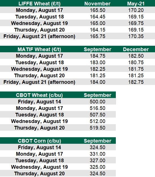 Grain markets recovered yesterday (Friday, August 21) following a midweek drop. MATIF wheat for September was at €184/t.