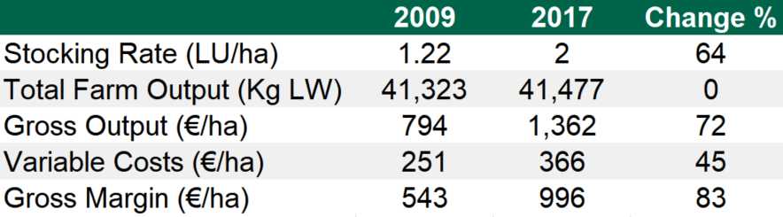 The output from the farm in terms of kilograms of LW (live weight) in 2009 was 41,323kg and – in 2017 – 41,477kg of LW was produced; the farm is producing more LW on 48ac less.