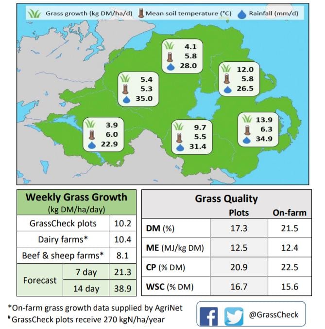 Researchers said temperatures had been higher than expected over the last week giving a small lift in grass growth rates across both its plots and farms.