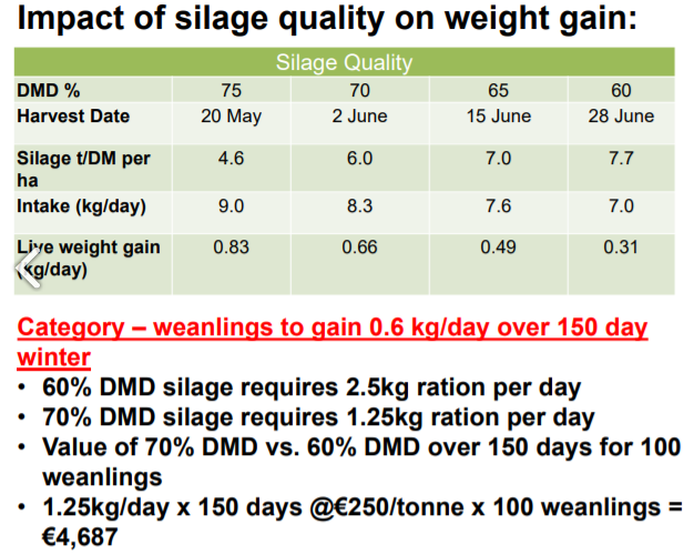 When silage quality falls to a sub-optimal level, increased levels of concentrate supplementation are required in order to achieve the targeted average daily gains for weanlings and finishing cattle.