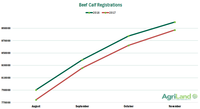 As the year progressed, the gap between 2016 and 2017 figures narrowed. Now that autumn-calving has finished up on most farms across the country, the current number of beef calves registered this year sits at 887,055 – a total drop of 13,119 on the number witnessed in 2016.