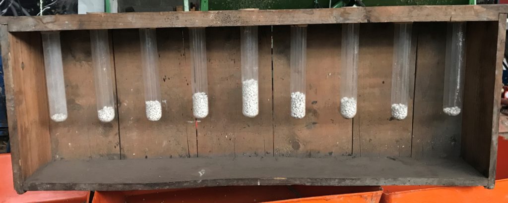 Each tray should be emptied into its own test tube and placed beside each other in the same order as they were in the field (as can be seen below). The same amount of fertiliser should be visible in each test tube (unlike the example shown below).
