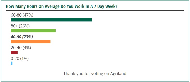 Of almost 1,500 respondents to the poll, 95% said they spend more than 40 hours a week working on the farm and 72% said they spend more than 60 hours a week working the farm.