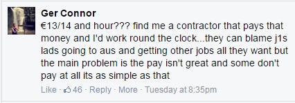 Ger Connor commented on Facebook “€13/14 and hour??? Find me a contractor that pays that money and I’d work round the clock”.